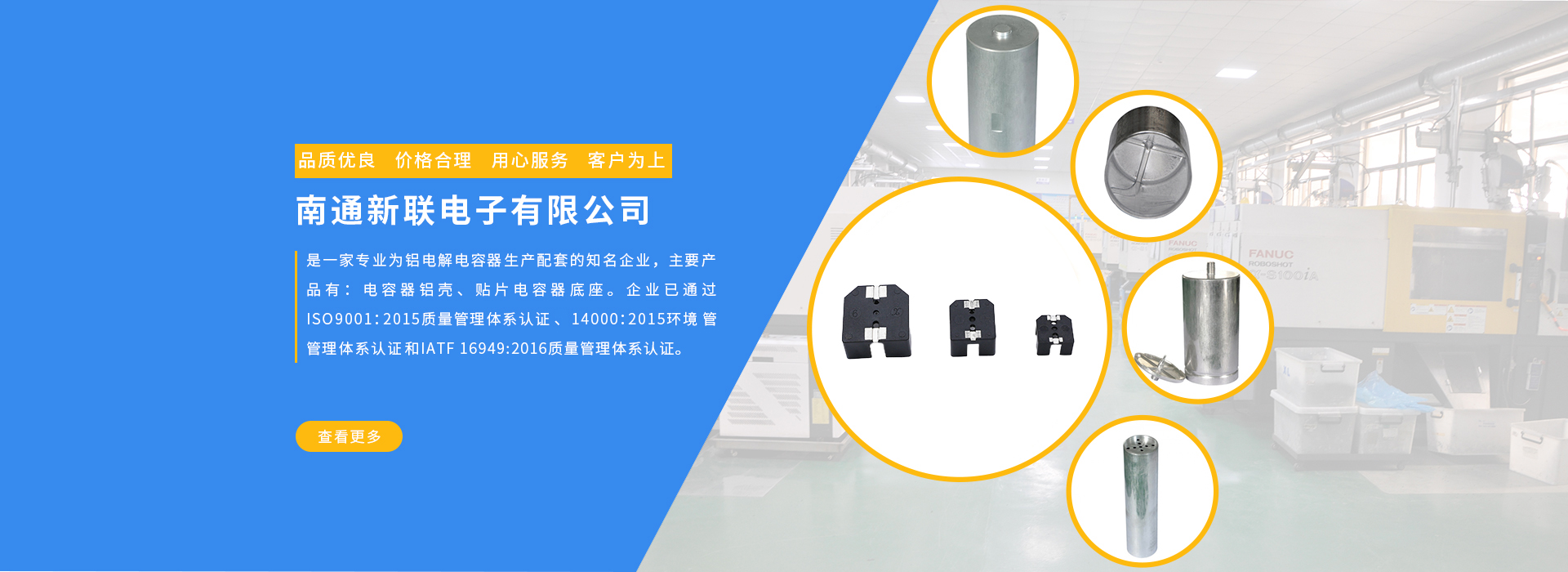 南通新聯(lián)電子有限公司是一家專業(yè)為鋁電解電容器生產(chǎn)配套的知名企業(yè),主要產(chǎn)品有:電容器鋁殼、貼片電容器底座。企業(yè)已通過ISO99001:2015質(zhì)量管理體系認證和14000:2015環(huán)境管理體系認證。企業(yè)... MORE